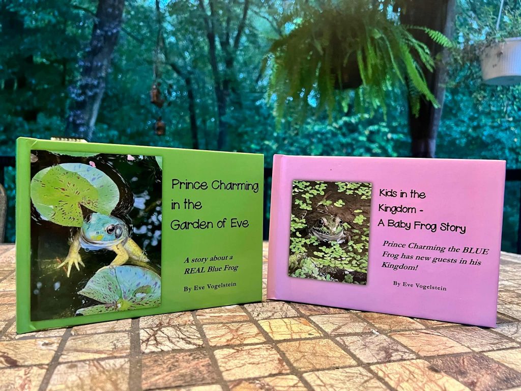 Prince Charming is a Northern Green Frog who has made his home in the Garden of Eve in Baltimore, Maryland. Because of a genetic deficiency, he can not make the color yellow like his other green frog friends and is a beautiful color BLUE. He is one in a million! He was so handsome, Eve decided to name him Prince Charming 🙂