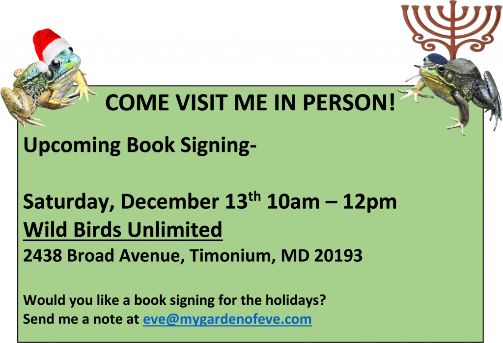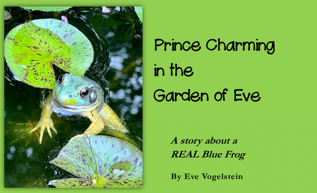 Prince Charming is a Northern Green Frog who has made his home in the Garden of Eve in Baltimore, Maryland. Because of a genetic deficiency, he can not make the color yellow like his other green frog friends and is a beautiful color BLUE. He is one in a million! He was so handsome, Eve decided to name him Prince Charming 🙂